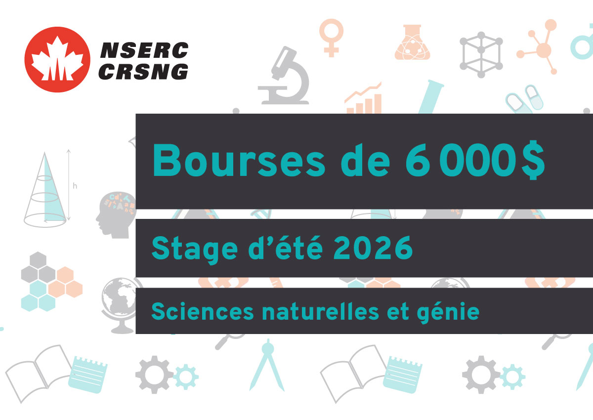 Le CRSNG offre des bourses afin de stimuler l’intérêt des étudiantes et étudiants canadiens ou résidents permanents de premier cycle pour la recherche. Ce concours vise les stages de recherche qui seront effectués à l’été 2026 (avril à août).