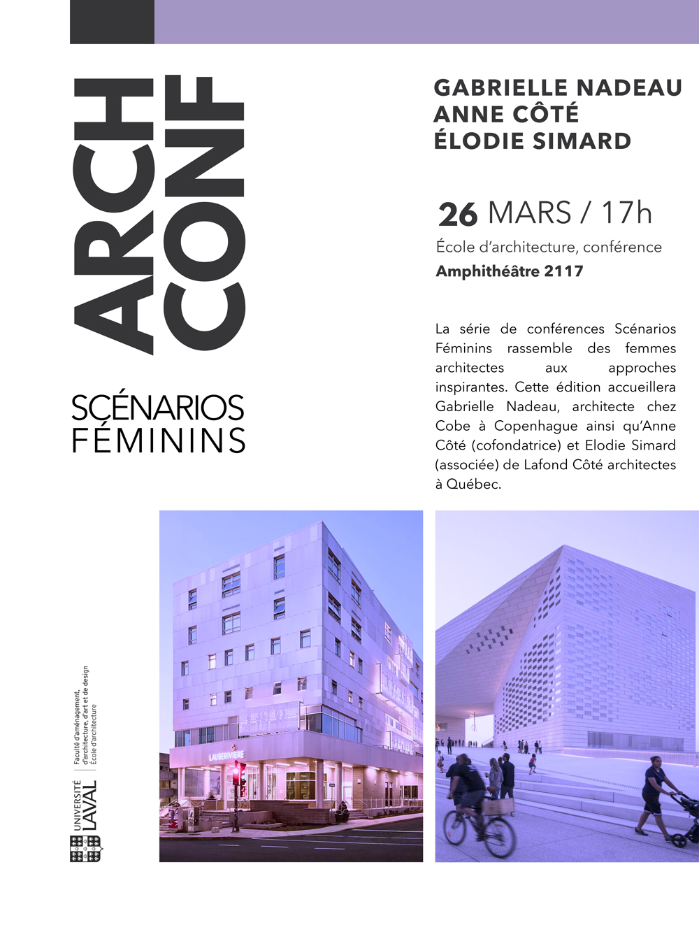 La série de conférences Scénarios Féminins rassemble des femmes architectes aux approches inspirantes. Cette édition se tiendra le 26 mars dès 17h à l’amphithéâtre (2117) et réunira Gabrielle Nadeau architecte chez Cobe à Copenhague (cofondatrice) ainsi que Anne Côté (cofondatrice) et Élodie Simard (associée) de Lafond Côté architectes à Québec. Les conférences seront suivies d’une table ronde animée par le professeur Samuel Bernier-Lavigne et la directrice Carmen Espegel, puis d’un vin d’honneur permettant de visiter ou revisiter l’exposition «Femmes architectes du changement» à la salle Jean-Marie-Roy (1106) dès 18h30.