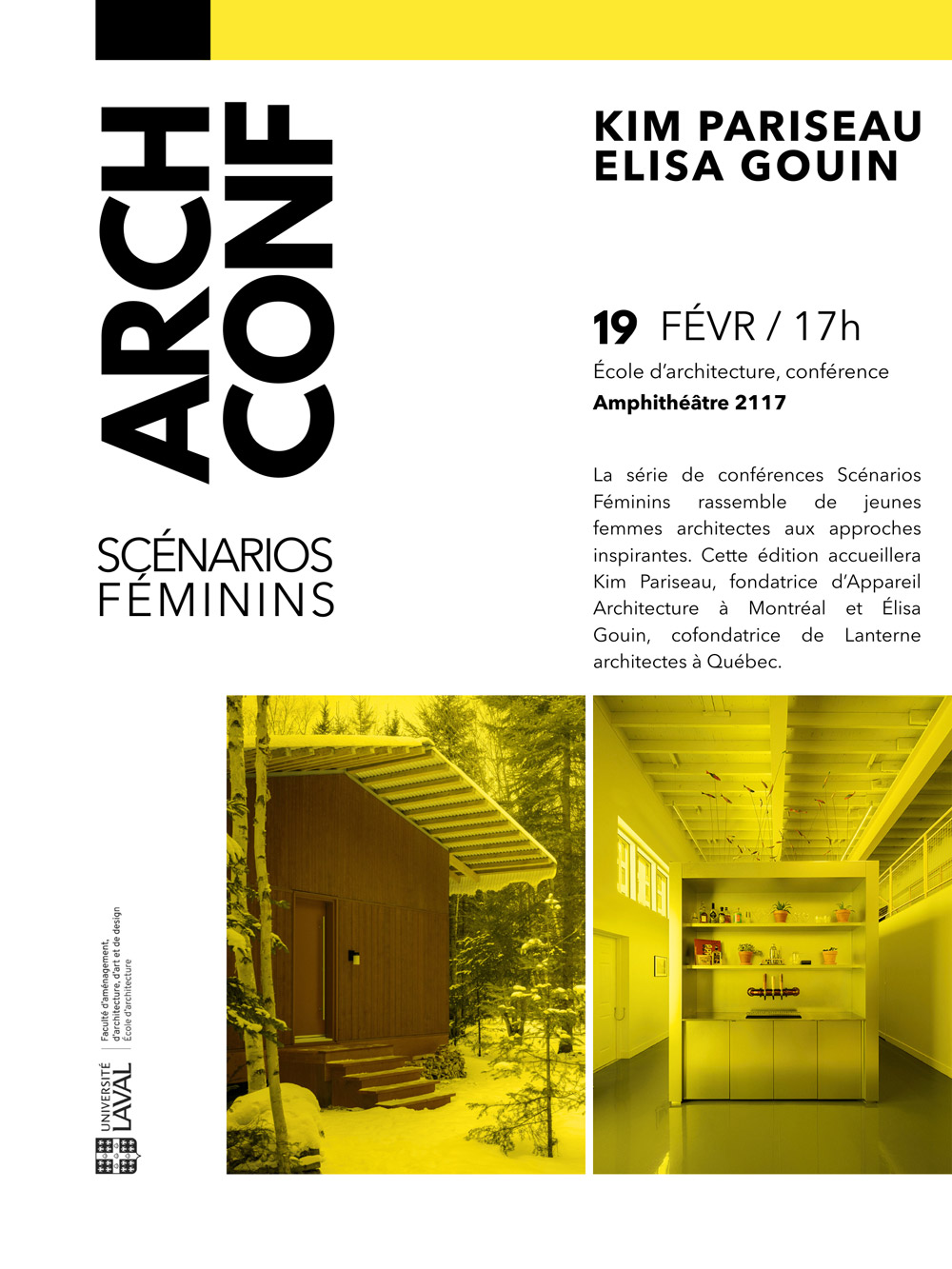 Cette édition s’ouvrira le 19 février dès 17h à l’Amphithéâtre (2117) avec une première conférence réunissant Kim Pariseau, fondatrice d’Appareil Architecture à Montréal, et Élisa Gouin, cofondatrice de Lanterne architectes à Québec. La conférence sera suivie d’une table ronde animée par Carmen Espegel et Carole Després.